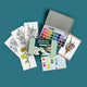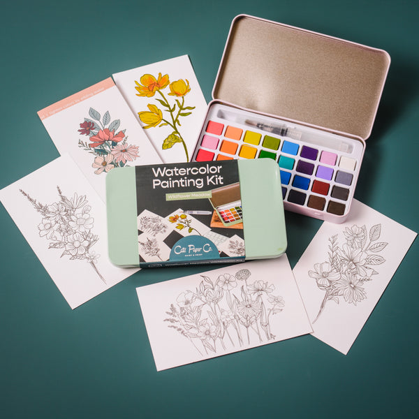 Paint your own watercolor wildflowers with these outlines and paints. This kit is compact and portable- everything packaged together in a tin painting box. Just add water to the included water brush and you can paint anywhere!