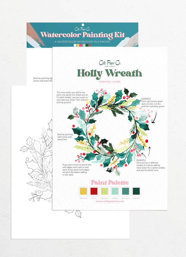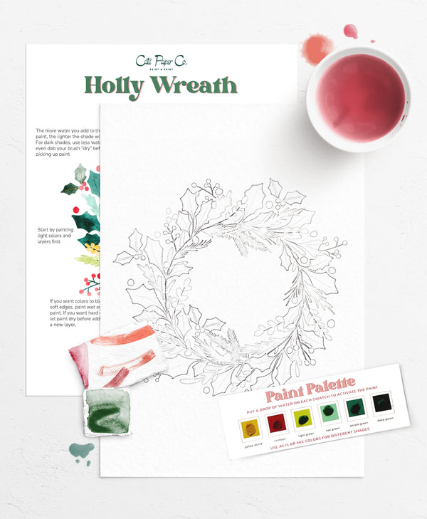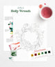 Paint your own watercolor holly wreath with this outline and paints. This kit is compact and portable- everything packaged together in a complete packet. Just add water to the included water brush and you can paint anywhere! No prior experience necessary, beginner friendly.