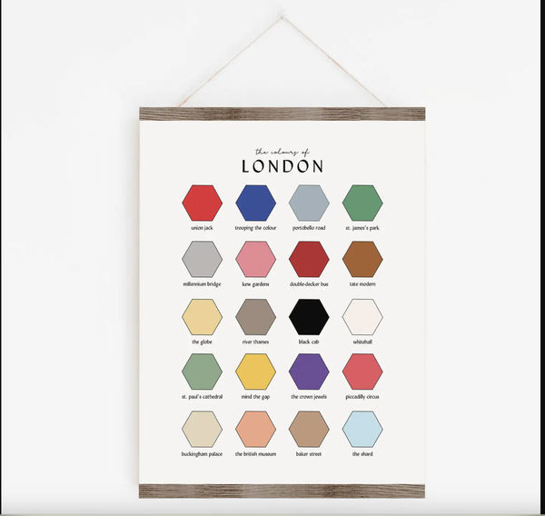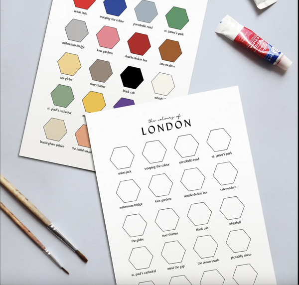 Paint your own Colours of London poster with this kit! Makes for a fun and relaxing activity, and your finished poster is suitable for hanging and enjoying for years to come. In this design, the 20 city location spaces are left blank. You pick which colors to fill in each space with! Use the included paint as is or mix new colors by combining different colors together.