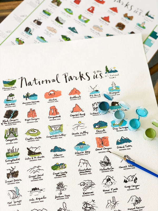 Paint your own National Parks with this paint-by-number and matching paints! Makes for a fun and relaxing activity, and your finished paintings are suitable for hanging and enjoying for years to come. In this design, the spaces are not numbered, use the provided color map guide to paint in your images.