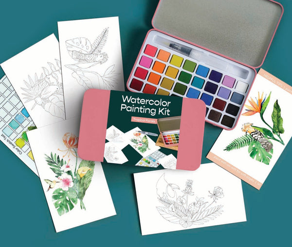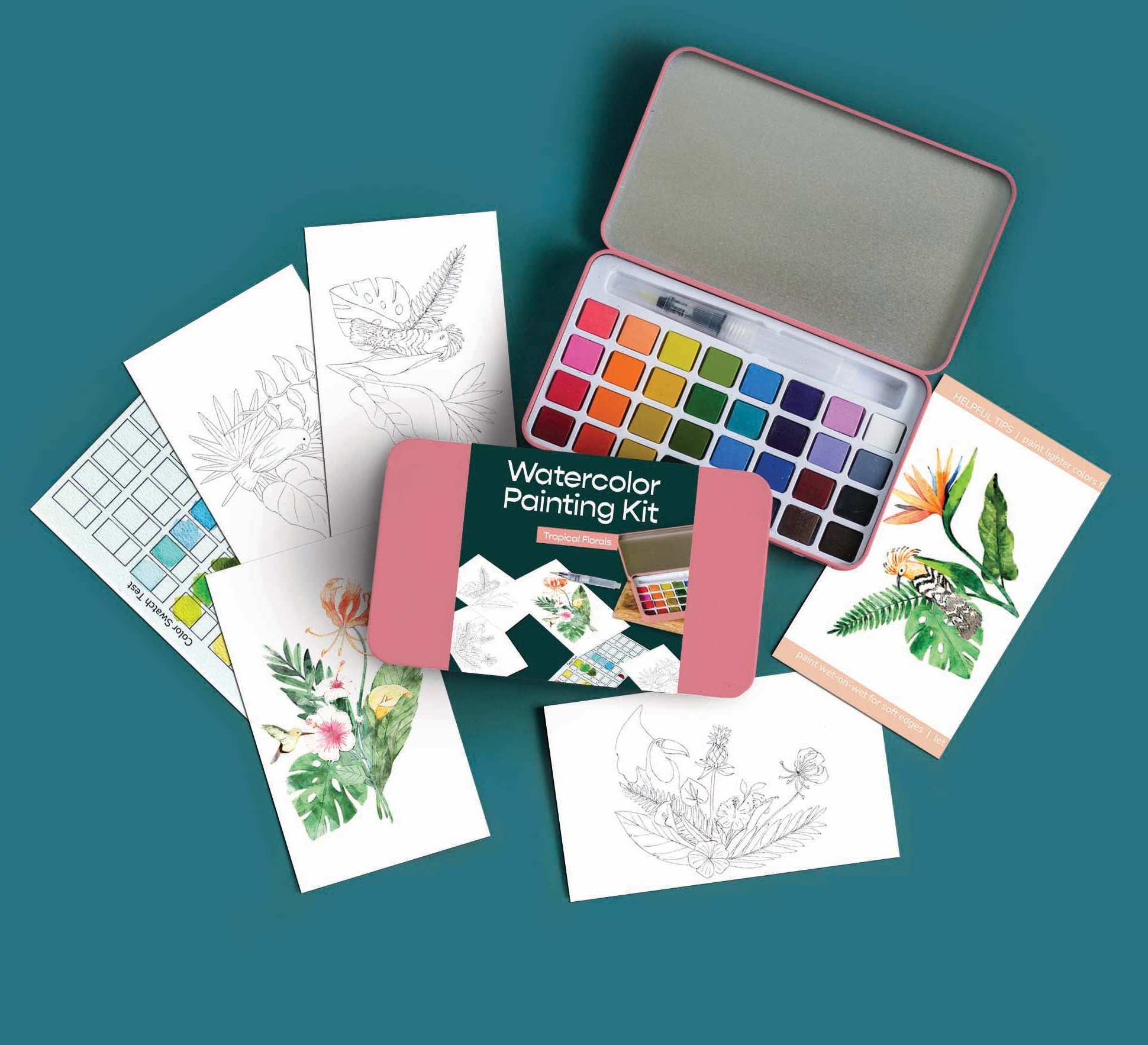 Paint your own watercolor tropical florals with these outlines and paints. This kit is compact and portable- everything packaged together in a tin painting box. Just add water to the included water brush and you can paint anywhere!