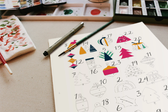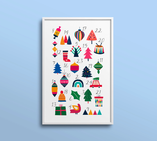 Paint your own Advent Calendar with this paint-by-number and matching paints! Makes for a fun and relaxing activity, and your finished paintings are suitable for hanging and enjoying for years to come. In this design, the spaces are not numbered, use the provided color map guide to paint in your images.