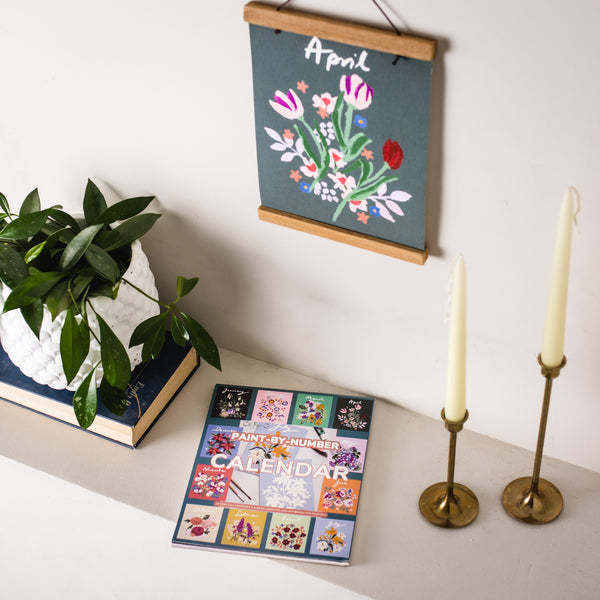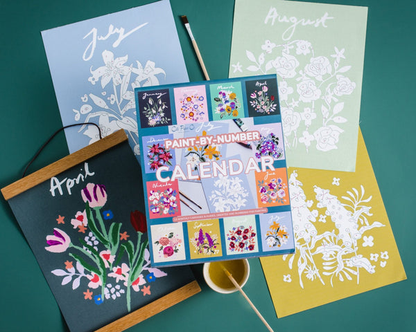 This paint-by-number calendar includes a canvas for each month of the year with a numbered outline to be painted. Complete the kit by including the corresponding acrylic paints. The calendar is not dated so it can be used year after year for monthly decor.